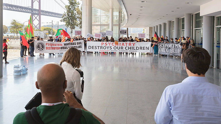 As psychiatrists from across the world arrived at the Congress Center Lisboa in Lisbon, Portugal, for the annual World Psychiatric Association (WPA) congress, they never expected what would greet them—CCHR protesters from across Europe demanding the abolition of damaging psychiatric practices. They stood right at the Congress Center’s front door with banners proclaiming “Psychiatry Destroys Our Children,” “Psychiatry: Lies That Destroy Families and Lives” and “Report Psychiatric Drug Abuse of Children.”