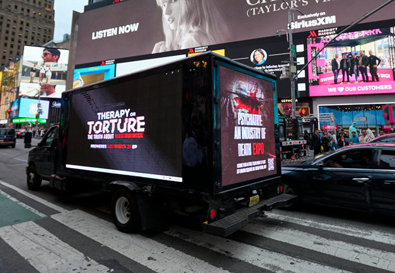 If APA annual meeting attendees covered their ears and looked upward to avoid the signs, they encountered a plane flying overhead, towing a banner that read, “Psychiatry Kills: Ban Electroshock.” Psychiatrists who sought cover in Times Square were confronted by a Jumbotron playing anti-ECT ads.