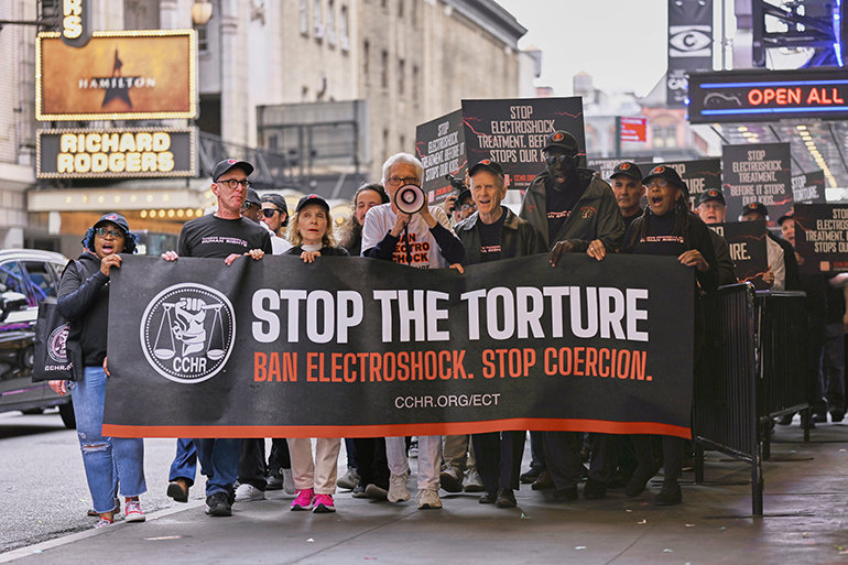 Outraged by the continued use of ECT, a large group of CCHR protesters, joined by members of community groups and their leaders, marched from Times Square to the Jacob Javits Convention Center in New York, the site of the annual APA conference. They greeted psychiatrists arriving at the conference with placards and signs reading: “Stop the Torture. Ban ECT,” “Stop Electroshock Treatment Before It Stops Our Kids,” and “Electroshock Treatment. A Fancy Word for ‘Kill Brain Cells.’”