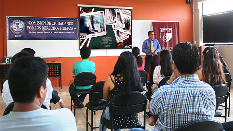 Martin Manco, a prominent Peruvian attorney who founded his country’s first CCHR chapter, lectures on psychiatric human rights violations to university students.